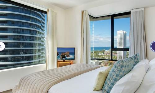Please note: We cannot guarantee the floor level you will be placed on or the type of view you will have. The fee is the same regardless, as the fee reflects the location of the apartment complex (a highly sought after location just one block from the beach, across from a popular shopping precinct, and with easy access to the Coast by light-rail), not the location/floor of the individual apartment.
